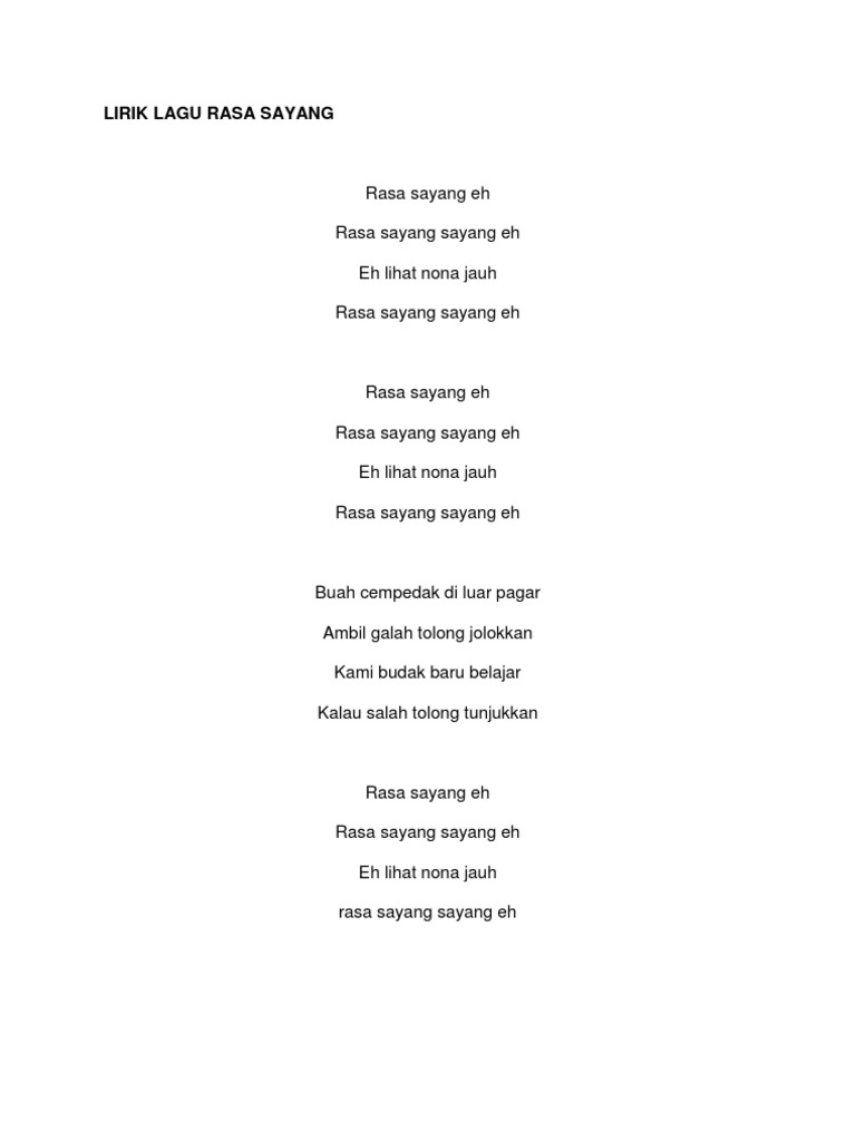 LAMPIRAN Lirik Lagu Rasa Sayang Hey- Lagu Kanak-Kanak Chorus Rasa sayang hey. LAGU RASA SAYANGE Musik telah dikenal sejak jaman nenek moyang kita. Dalam situs video share YouTube warga dari kedua negara Indonesia.
